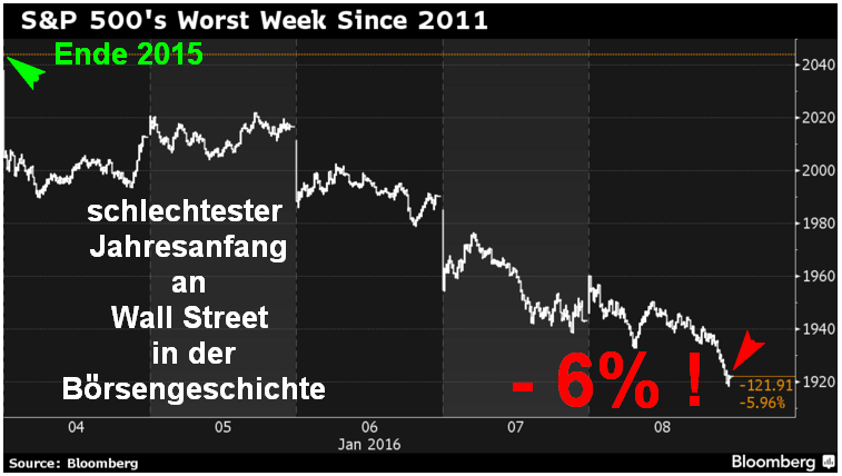 Dies war der schwächste Jahresbeginn in der Geschichte der Wall Street. Noch nie gab es beim Dow Jones so eine schlechte erste Börsenwoche seit seiner Erstnotierung vor fast 120 Jahren. Auch beim S&P 500 Index war es das größte Minus zu Jahresanfang seit 1928.